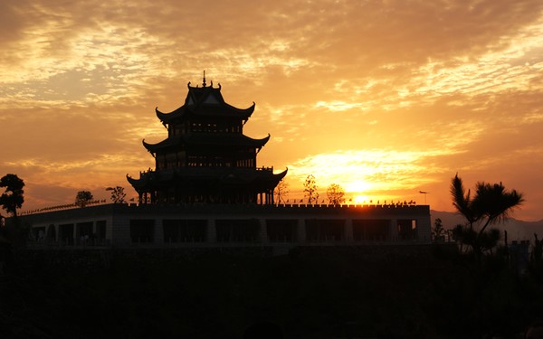 起名“問天閣”,源于2000多年前中國詩人屈原對自然界和人生求索的名作——《天問》,又因其為文博園最高建筑,問天閣這個名稱就應運而生了。其座西面東,坐落在烽火臺座上,占地面積約3000平方米,為三層三重檐,呈方亭式,每面57米。