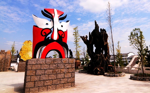 坐落于五千年文化長廊的京劇臉譜造型,其含基座高4米,寬1米6,并沒有根據(jù)某位人物造型打造,而出自于五千年文博園自己的創(chuàng)意,以紅白兩色為主色,大膽的運用寫真、夸張、抽象的藝術形式,結合獨創(chuàng)的手工藝制作而成。其色彩鮮明、立體感強、線條柔美,打破了固定譜式的束縛,完全從一個全新的角度理解和認識臉譜藝術,試圖從中探求一條臉譜在現(xiàn)代生活中的現(xiàn)實意義和藝術價值。