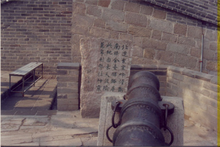 陳展于八達(dá)嶺關(guān)城內(nèi)登城入口處的馬道旁,共有五尊鐵炮,為當(dāng)時(shí)的先進(jìn)武器之一。其中最大一尊炮筒長2.85米,口徑105毫米,射程達(dá)千米以上,威力甚大。炮身上刻有"敕賜神威大將軍"字樣,為明代崇禎十一年(1638年)制造。該炮是1958年從八達(dá)嶺東十余里的張堡地方運(yùn)來的。另外四尊牛腿小炮,為1957年整修長城時(shí)的出土文物,同時(shí)還發(fā)掘出數(shù)百枚炮彈,均為明朝制品。據(jù)《武備志》記載:“古代以機(jī)發(fā)石,其機(jī)之木架,形如虎蹲。后來使用火炮,炮身短而粗大,以發(fā)開花彈者,名虎蹲炮,俗稱田雞炮”,由此可見當(dāng)時(shí)武器情況之強(qiáng)盛。