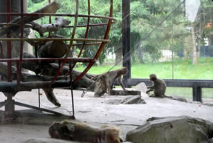 猴山位于園的東部,占地面積約1000平方米,為下沉式結(jié)構(gòu),場(chǎng)館中央用山石堆積成兩座假山,之間懸掛軟梯、輪胎等游樂(lè)設(shè)施。外圍橢圓形的圍墻,圍墻高3.1米,從假山到圍墻的距離為5.9米。在北側(cè)的圍墻處,有一空間,可供猴群在惡劣的天氣里遮風(fēng)避雨。1986年和1993年,兩次對(duì)猴山進(jìn)行維修和改造,加固山石,接通上、下水。因不時(shí)會(huì)發(fā)生頑皮、健壯的成年猴子,借山石之力躍出猴山,為此,沿墻壁設(shè)置低壓電網(wǎng),并根據(jù)猴子對(duì)色彩的不同反映,在電網(wǎng)處涂上紅、白兩種顏色,以引起猴子的警覺(jué)。