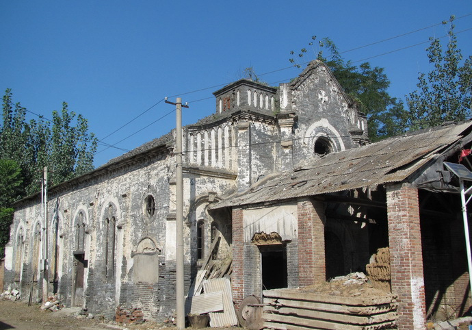 太和莊天主教堂 太和莊天主教堂,創(chuàng)建于民國三年(1914年),解放后即棄置不用。坐北朝南,是一座法國天主教教堂建筑,是房山區(qū)最早建立的教堂,也是房山區(qū)唯一一座保存基本完整的未經(jīng)拆改的教堂。面闊三間,進深六間。山墻頭一間兩側開券門。板瓦頂清水脊。堂內(nèi)有兩排八角磚柱。盡頭設石供桌,現(xiàn)已無存。