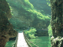 棧道:京東大峽谷以五潭稱奇,然而跨四潭的棧道也稱標(biāo)新立異,各不相同,成為大峽谷的又一奇觀,一、二棧道依崖而成,似長龍臥坡,四潭棧道由數(shù)十根鋼索相連而成,攀崖而上,跨潭而過,似臥頂長虹,走在上面搖搖晃晃,險象橫生,難免不讓人想起紅軍強渡“大渡河”、勇過鐵索橋的壯舉,游客們身臨其境,其感覺自當(dāng)終生難忘。