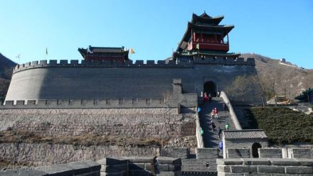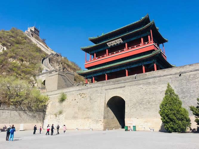 4.軍事防御范圍廣,周圍面積50多公頃,南北券城相距約850米左右,東山頂至西山頂直線距離1150米,防御設施有南、北券城、城樓、水門、水閘、敵樓、鋪房、烽隧、角樓、炮臺等。長城上的敵樓、烽燧、鋪房,是古代打仗時作為掩體和士兵居住的地方,共修復了25座,這些按明代規(guī)制燒的城磚,都是靠人工、牲畜往上運送材料。高大雄偉的城樓,南北各有一座,樓為三重檐歇山式綠琉璃瓦翦邊,高21米,下面城臺高10米。城樓是指揮作戰(zhàn)的中心,所以建造高大。站在樓上,可以一目了然,有利于觀敵情。城臺下面有券門通甕城。甕城即大城門外的月城,用以增強城池的防御力量。