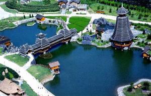 侗族建筑:侗族建筑景區(qū)占地4000平方米,建筑面積571平方米,建筑復(fù)原按貴州省從江、黎平地區(qū)的侗族典型建筑。規(guī)劃形式為寨,由鼓樓、風(fēng)雨橋、寨門(mén)、戲臺(tái)、民居、水車、碾房、谷倉(cāng)、稻田等組成。侗族建筑以杉木為原料,民居形式為干欄式。