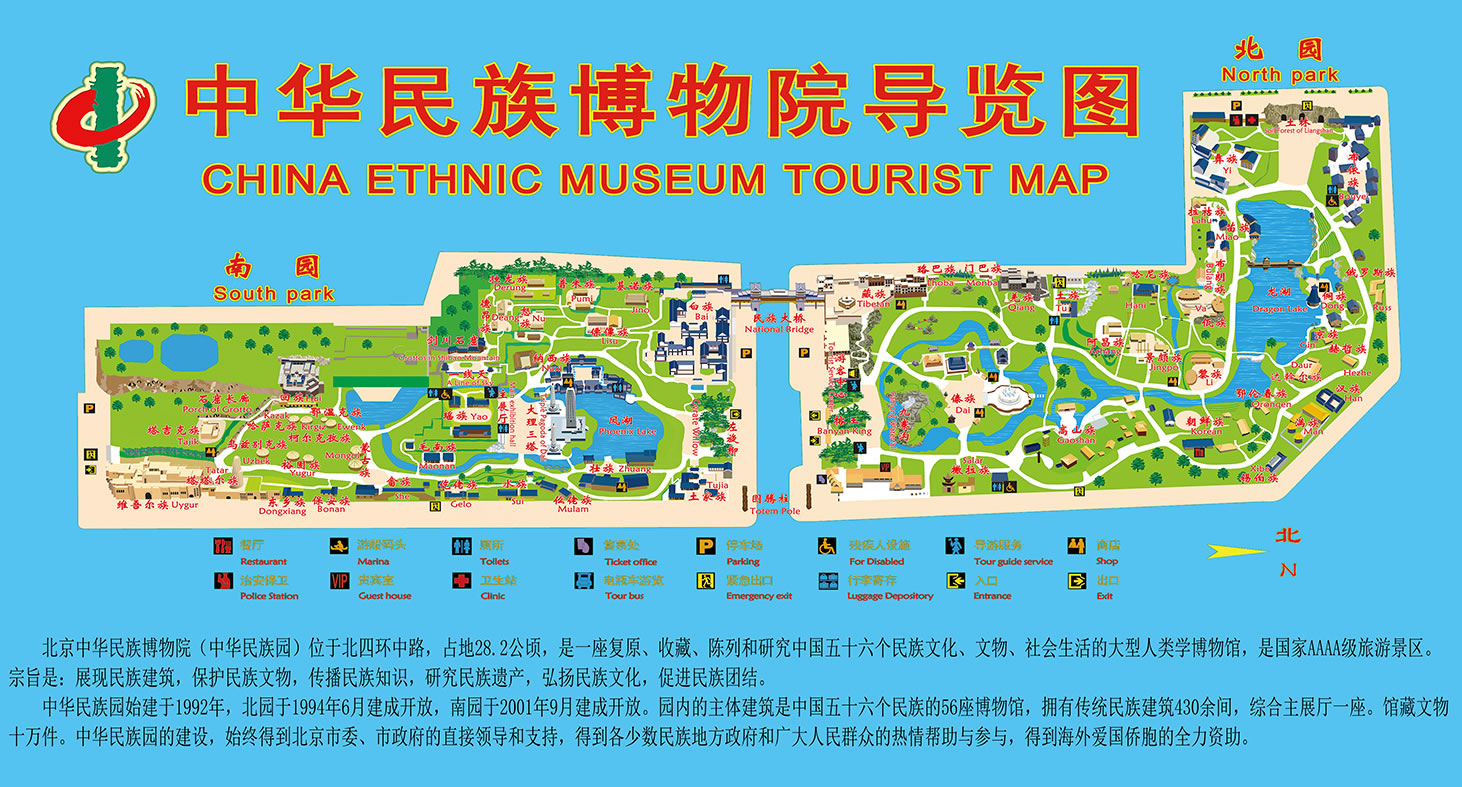 北京中華民族園,是集中國(guó)少數(shù)民族的傳統(tǒng)建筑、民族風(fēng)情,歌舞表演,工藝制作以及民族美食為一體的大型民族文化園地。園內(nèi)建有國(guó)內(nèi)最大伯鑄鐵雕塑以及仿真的熱帶榕樹(shù)林、水中溶洞,土林、盤(pán)龍瀑布,滄源巖畫(huà)、阿里山神木等。南園也已建成完畢,主要有民族博物館和雕塑廣場(chǎng)等大型設(shè)施,以及二十余個(gè)民族村寨。