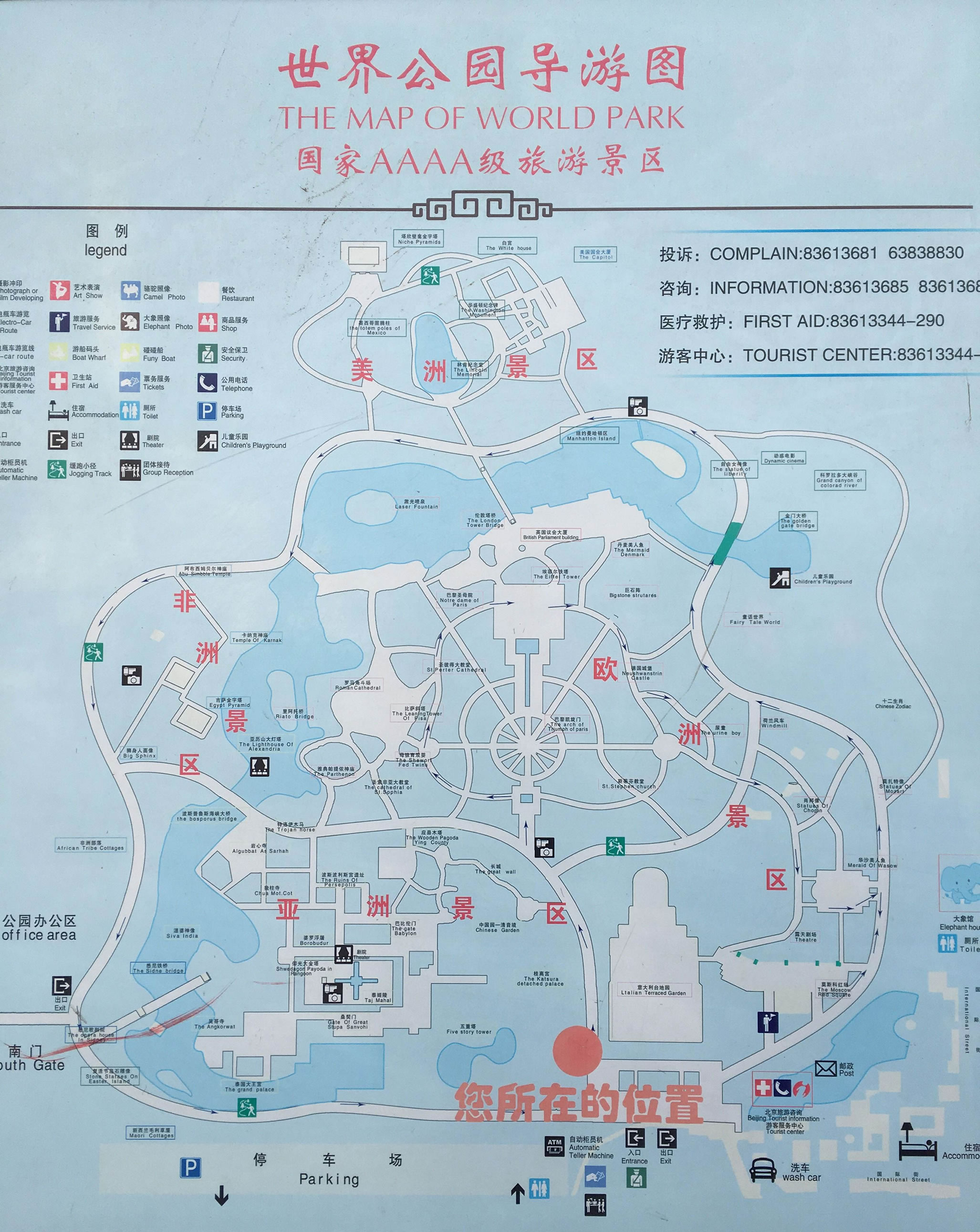 步入公園大門,迎面便是寬闊壯麗的意大利臺(tái)地園,然后順時(shí)針方向進(jìn)入亞洲景區(qū),首先見到日本的桂離宮,依次是中國園林清音境、萬里長城、莫高窟、應(yīng)縣木塔,還有波斯波利斯宮遺址(伊朗)、婆羅浮圖(印度)、巴比倫門(伊拉克)、泰姬陵(印度)、仰光大金塔(緬甸)、吳哥寺(柬埔寨)、泰國大王宮;然后跨過悉尼鐵橋進(jìn)入“澳洲”,可以觀賞毛利草屋(新西蘭)、悉尼歌劇院(澳大利亞);接著進(jìn)入“非洲”沙漠,巡看非洲部落、獅身人面像(埃及)、吉薩金字塔(埃及)、阿布·西姆貝爾神殿(埃及)、卡納克神廟(希臘)和亞歷山大燈塔(埃及);超過博斯普魯斯海峽大橋,就進(jìn)入到“歐洲”,可以欣賞到特洛伊木馬(土耳其)、圣·索菲亞大教堂(烏克蘭)、雅典衛(wèi)城(希臘)、羅馬競技場(意大利)、比薩斜塔(意大利)、圣·彼得大教堂(俄羅斯),便游到公園中心凱旋門(法國),依次游布直塞爾第一公民景點(diǎn)(比利時(shí)),德國城堡、埃菲爾鐵塔(法國)、巴黎圣母院、大本鐘(英國);漫步倫敦塔橋,便進(jìn)入“美洲”,依次可以看到美國的宇航中心,林肯紀(jì)念堂、華盛頓紀(jì)念碑、白宮、國會(huì)大廈、紐約曼哈頓區(qū)和自由女神像,穿過科羅拉多大峽谷(美國),邁過金門大橋(美國),便到了十二生肖像,看到荷蘭風(fēng)車,又可贍仰德國音樂家肖邦像和莫扎侍像,還可看到“華沙 美人魚”,最后到達(dá)“莫斯科紅場”。漫游“世界”一周后,再到“國際街”購物、小吃、休憩,感嘆世界真奇妙不看不知道。