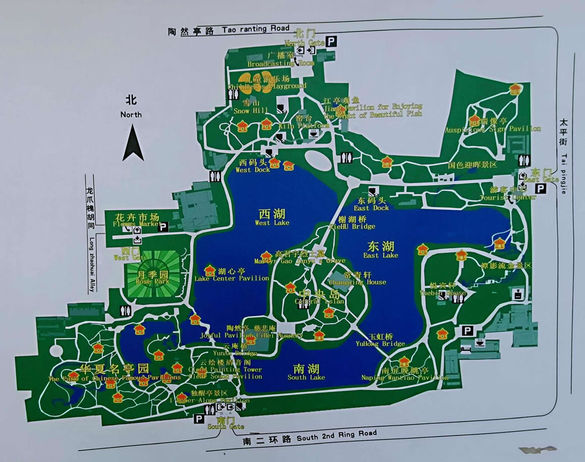 陶然亭公園內(nèi)有勝春山房景區(qū)、華夏名亭景區(qū)、陶然佳境景區(qū)、陶然佳境景區(qū)、潭影流金景區(qū)等各具特色的景區(qū)。其中著名的陶然亭位于湖中央島的陶然佳境景區(qū),陶然亭周圍,有許多著名的歷史勝跡。西北有龍樹(shù)寺,寺內(nèi)有蒹葭簃、天倪閣、看山樓、抱冰堂等建筑,堪與陶然亭相匹。東南有黑龍?zhí)丁埻跬、哪吒廟、刺梅園、祖園;西南有風(fēng)氏園;正北有窯臺(tái);東北有香冢、鸚鵡冢,以及近代的醉郭墓、賽金花墓等。這些歷史勝跡產(chǎn)生年代多早于陶然亭,有的甚至早于慈悲庵。它們都有文人墨客觴詠的歷史,曾現(xiàn)過(guò)各領(lǐng)風(fēng)騷的輝煌時(shí)期。