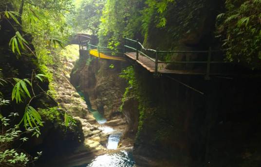 金刀峽位于重慶市北碚區(qū)金刀峽鎮(zhèn),華鎣山西南麓,是國家AAAA級旅游景區(qū)。傳說峽中有一把金刀,每當夜晚時分,金光閃閃照耀峽谷,元朝末年,華鎣山下有一壯士張昆,此人早年靠采薪伐木為生,時常出沒于華鎣山的深山老林之中。一日,張昆迷失于一峽谷之中。當夜正值月圓,柔柔的月光輕輕地瀉進峽中,張昆正陶醉于此情此景,卻見峽中深處有一事物在月光映照之下發(fā)出金燦燦的光輝。張昆近一看,原來是一把插入峽壁巖石的金刀。遂上前拔刀,不想紋絲不動嵌在石縫中的金刀竟被輕輕抽出。張昆大喜:天賜金刀,定是降大任于我也!張昆憑此刀披荊斬棘,終得以出峽,金刀峽也因此而得名。金刀峽全長約10公里,分上峽、下峽兩段,其中峽谷內(nèi)棧道全長近7公里。上峽由于喀斯特地質(zhì)作用,地面切割強烈,形成獨特的峽谷溝壑,兩岸石壁如削,山勢岈合,垂直高度超過百米,上有古藤倒掛,下有潺潺流水;下峽由于流水侵蝕作用,有眾多洞穴群,潭潭相連,碧玉串珠,飛泉瀑布層層疊疊,古鐘乳、石筍、石柱千姿百態(tài)。主要有驚魂臺、藏刀洞、懸天飛瀑、天犬洞、神鷹峽、獅頭峽、一線天、沙溪湖、中峽天然浴場、千幻古巖、彌勒佛、心形潭等四十多個景點。