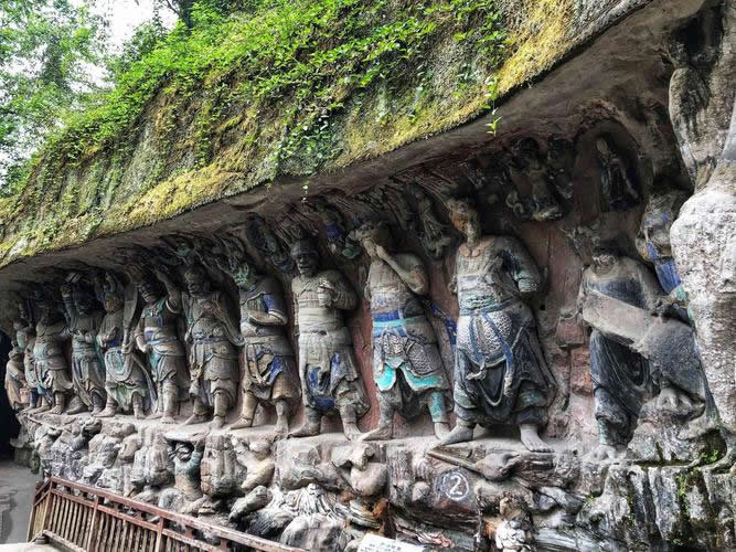 寶頂山位于大足區(qū)龍崗街道東北15千米處,海拔527.83米。寶頂山摩崖造像始鑿于南宋年間,四周2.5千米內(nèi)山巖上遍刻佛像,包括以圣壽寺為中心的大佛灣、小佛灣造像。以大足大佛灣為主體,小佛灣次之,分布在東、南、北三面。巨型雕刻360余幅,以六道輪回,廣大寶樓閣、華嚴(yán)三圣像、千手觀音像等最為著名。