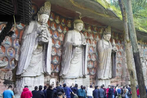 重慶市的大足石刻以其規(guī)模宏大、雕刻精美、題材多樣、內(nèi)涵豐富和保存完整而著稱于世。它集中國佛教、道教、儒家“三教”造像藝術(shù)的精華,以鮮明的民族化和生活化特色,成為中國石窟藝術(shù)中一顆璀璨的明珠。它以大量的實物形象和文字史料,從不同側(cè)面展示了九世紀(jì)末至十三世紀(jì)中葉中國石刻藝術(shù)的風(fēng)格和民間宗教信仰的發(fā)展變化,對中國石刻藝術(shù)的創(chuàng)新與發(fā)展做出了重要貢獻,具有前代石窟不可替代的歷史、藝術(shù)和科學(xué)價值。許多歐洲人、尤其是法國人,對大足石刻寵愛倍加。