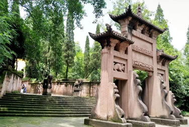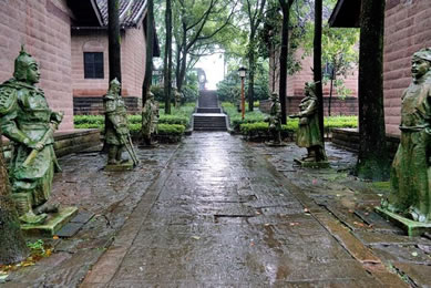 忠義祠位于護國寺右側(cè),與寺內(nèi)藥師殿僅一墻之隔,有門洞與護國寺相通,也可從護國寺右側(cè)小道進入。始建于明弘治七年(1494年),原名“王張祠”,祀王堅、張玨二將忠烈。明弘治十二年(1499年),合州知州宋琢見“王張祠”簡陋而集資整修。明正德十二年(1517年),合州知州佘崇鳳刻石立碑并培修祠宇。清初,“王張祠”遭兵亂,片瓦無存。清乾隆二十四年(1759年),合州知州王采珍重修,立余玠、王堅、張玨、冉琎、冉璞5位牌位祀祭,改祠名為“忠義祠”。后歷經(jīng)培修。忠義寺整座建筑由正廳、耳房和左右?guī)拷M成,采用均衡對稱式,在縱軸線主要建筑物相對對峙,構(gòu)成大門進出的三合院。整座庭院東西寬20米,南北縱深30米。進入石坊形大門是一個院壩兩面的廂房,拾級而上至正廳。迎面高懸“忠義千秋”金字巨匾,匾下祭臺上排列余玠、王堅、張玨、冉琎、冉璞牌位。祭臺正面有祝文:“維神才兼武,志秉忠貞。畫地成城,據(jù)形勝而保蜀土;協(xié)力戰(zhàn)守,遺魚餅以退元戎。忠誠貫日星,先后相繼;大節(jié)凌霄漢,古今照臨。茲屆仲春修祀典,肅陳籩豆,伏維來歆。尚饗。”廳堂楹柱有華國英撰寫的對聯(lián),上聯(lián)“持竿以釣中原,二三人盡瘁鞠躬,直拼得蒙哥一命”;下聯(lián)“把盞而澆故壘,十萬眾披肝瀝膽,竟不圖王立二心”。忠義祠內(nèi)有宋孝宗時期碑文4塊,宋光宗時期2塊,宋寧宗時期5塊,乾道年間以后22塊,其中記錄釣魚城之戰(zhàn)史跡的12塊。