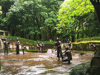 采石場遺址位于釣魚城基本陳列一展廳正對的游步道頂端。為讓游人了解釣魚城筑城之艱難與古代民眾付出之艱辛,遺址還原了700多年前釣魚城筑城采石的勞動場景,其中的人物雕塑大小比例與真人一致。他們有的手握鋼釬在撬石頭,有的拿著手錘打鏨子,有光著胳膊抬石頭,同時還有前來送水的婦女與小孩,每個人物惟妙惟肖,充滿濃郁的生活味。
