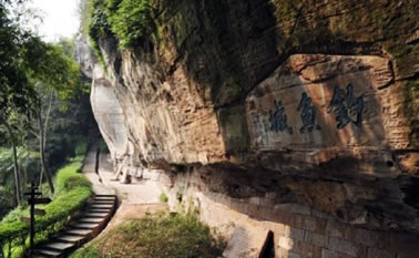 三圣崖又稱“三佛崖”。在釣魚山“古釣魚城”摩崖側(cè)、距地表3.5米的崖壁上。為清道光二十三年(1843年)護國寺與白塔寺住持智慧和尚及眾門徒捐資刻造。在長4米、寬3米的凹型石龕中,是阿彌陀佛(正中)、觀世音菩薩(左)、大勢至菩薩(右)三尊面西結(jié)跏趺坐蓮臺神像。造像神情逼真,軀體肌肉豐滿,栩栩如生。佛龕下為清光緒十三年(1887年)合州舉人朱宗言題刻的“蕩胸生層云”5字,字徑尺。