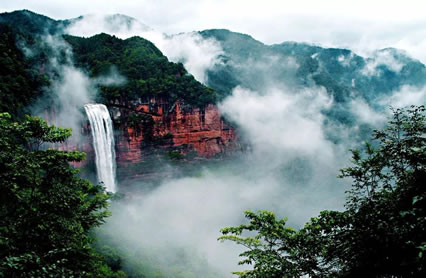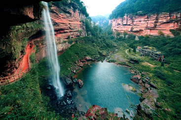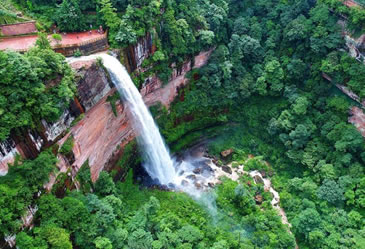 土地巖瀑布在土地巖壁畫(huà)對(duì)面,如一潔凈的白緞懸垂而下。瀑布高89米,寬25米,懸垂于綠樹(shù)紅巖之中,三面赤壁環(huán)繞,與巨幅丹霞赤壁兩相呼應(yīng),形成四山鎖絕谷、一水落幽林、綠樹(shù)映湖色、丹霞醉畫(huà)屏的絕景。
