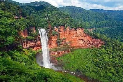一雄一雌,一南一西,對(duì)巖相望,故名鴛鴦瀑布。南瀑高110.82米,為雄瀑,瀑水時(shí)而懸垂跌落,時(shí)而貼臂滑流;西瀑高90.25米,是雌瀑,瀑水絲絲縷縷,猶如戀人的情絲。雙瀑相望,一路飛珠涌向?qū)Ψ,最后在谷底融為一體,向北而去。