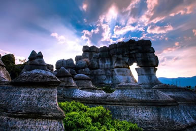 萬盛石林景區(qū),不僅怪石林立,且地下溶洞景觀遍布。主要為水平溶洞和垂直溶洞兩種。水平溶洞有天門洞、過街樓溶洞、涼風洞、仙女洞、關馬洞、偷牛洞、九龍洞、觀音洞等。其中,數天門洞景觀獨特,造型別致,洞內石筍、石柱、石花、石幔,吊、立、鉗,各盡其志,如玉器晶瑩,如宮殿輝煌?芍^“天造地設,鬼斧神工”。