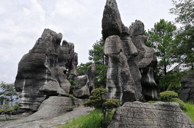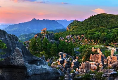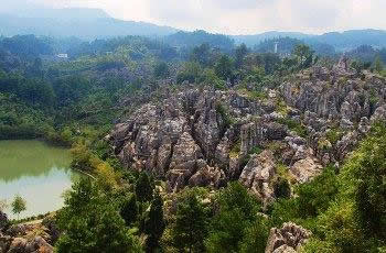 以地表石林為代表的典型的喀斯特地貌景觀十分吸引人。該類景觀表面呈虎皮狀,形成一系列各不相同的觀賞景點。在這里,群峰壁立,奇峰危石,可謂千姿百態(tài),石門、石寨、石柱等,酷似人工堆疊,卻無人工痕 跡;飛禽走獸的石頭,栩栩如生、惟妙惟肖;田園阡陌、炊煙裊裊,清泉碧池、懸崖雪瀑,白鶴青 、 碧空鳥語,清麗若未施粉黛的閨秀楚楚動人。其主要景觀有情朗峰、香爐山、巨扇、地縫一線天、化石 、石鼓、將軍石等數十處。顯示出萬盛石林景觀的美感與靈性。