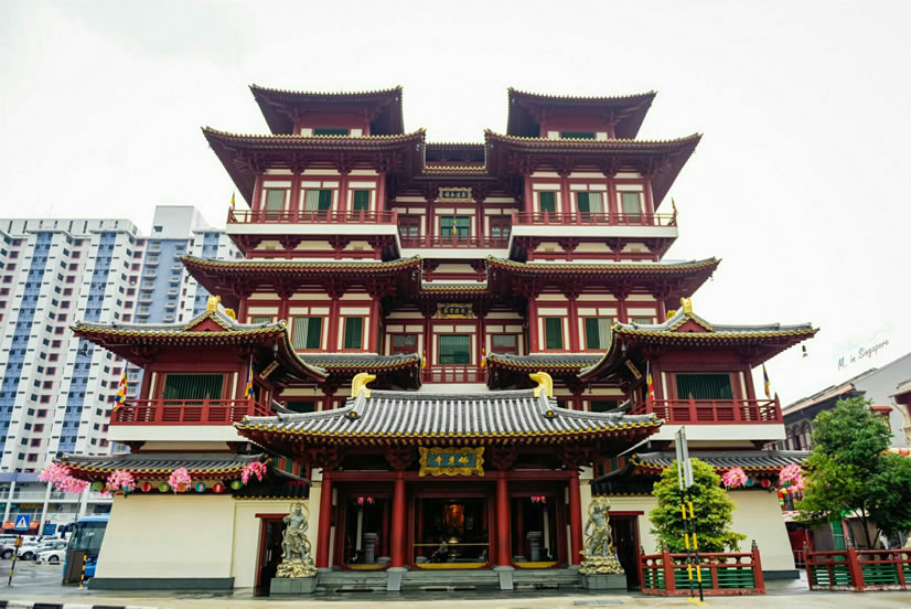 新加坡佛牙寺 新加坡佛牙寺坐落于牛車水碩莪街,樓高五層,全按中國唐代佛寺風格建筑而成。第一層是山門、鐘樓、鼓樓、觀音殿、百龍殿。第二層是阿蘭若藏經(jīng)閣及展覽廳、文殊殿,夾層樓是蓮芯茶坊、地藏殿、法堂、戒光堂、諸山長老德像紀念館。第三層是普賢殿、龍華院—佛教文物館。第四層是靈光殿、佛牙舍利金塔。第五層頂樓有萬佛閣、毗盧遮那大光明經(jīng)咒轉(zhuǎn)經(jīng)輪藏、萬福光明燈和胡姬花園。