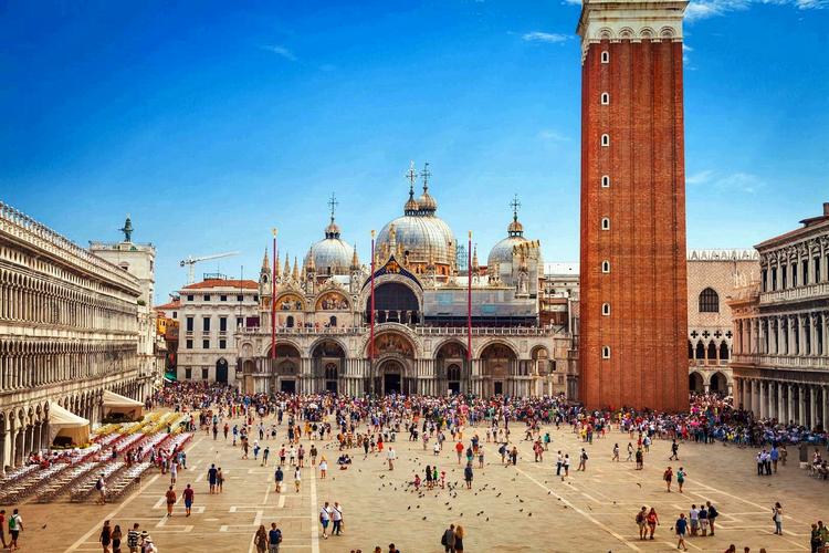 圣馬可廣場 圣馬可廣場(Piazza San Marco) ,官方標(biāo)準(zhǔn)譯名圣馬爾谷廣場,又稱威尼斯中心廣場,一直是威尼斯的政治、宗教和傳統(tǒng)節(jié)日的公共活動(dòng)中心。圣馬可廣場是由公爵府、圣馬可大教堂、圣馬可鐘樓、新、舊行政官邸大樓、連接兩大樓的拿破侖翼大樓、圣馬可大教堂的四角形鐘樓和圣馬可圖書館等建筑和威尼斯大運(yùn)河所圍成的長方形廣場,長約170米,東邊寬約80米,西側(cè)寬約55米。廣場四周的建筑從中世紀(jì)到文藝復(fù)興時(shí)代都有。 圣馬可廣場初建于9世紀(jì),當(dāng)時(shí)只是圣馬可大教堂前的一座小廣場。馬可是圣經(jīng)中《馬可福音》的作者,威尼斯人將他奉為守護(hù)神。相傳828年兩個(gè)威尼斯商人從埃及亞歷山大將耶穌圣徒馬可的遺骨偷運(yùn)到威尼斯,并在同一年為圣馬可興建教堂,教堂內(nèi)有圣馬可的陵墓,大教堂以圣馬可的名字命名,大教堂前的廣場也因此得名“圣馬可廣場”。