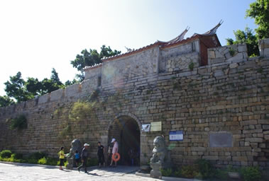 城內(nèi)有四個(gè)城門,南北門相距約500多米,東西門相距約300多米。東、西、北三座城門相似,各有兩道城門,外加筑月城,上建城樓,城門上各設(shè)烽火臺(tái)一座,南城門則外加設(shè)一照墻,照墻前有一尊關(guān)公雕像。相傳當(dāng)年倭寇炮轟城池,城內(nèi)關(guān)帝廟的關(guān)云長把青龍偃月刀一揮,炮彈被撥落在城墻旁,再一揮,炮彈射回賊船,于是船沉寇亡。西門的兩道城門如今依舊完好地保留下來。蔭涼的城門下擺有幾個(gè)小攤子。城內(nèi)的十字大街聯(lián)結(jié)著四個(gè)城門,街道則由一塊塊石板鋪就而成。