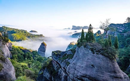 冠豸山風(fēng)景區(qū)屬丹霞地貌,蒼玉峽逶迤而入,一石若懸,流泉從石間穿過(guò),潺潺不斷,逾半山處,巨石之上立一松風(fēng)亭。半云亭筑在山間突出部,仰崖上古樹(shù),郁郁蒼蒼,如在半天。