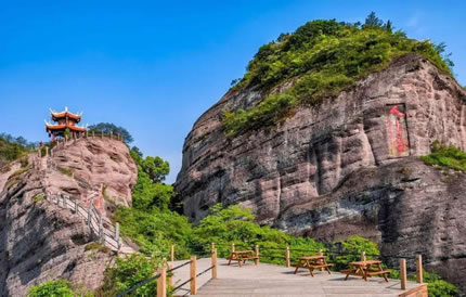 冠豸山屬于丹霞地貌,其自然形態(tài)之美在于山之奇險(xiǎn)與幽秀,水之清冽與甘甜。遠(yuǎn)望冠豸,山并不高。登上盤(pán)旋的山路,走過(guò)“蒼玉峽”,來(lái)到“半云亭”時(shí),便自然產(chǎn)生“云層覺(jué)路嶺千尋”的感覺(jué)。丹梯云棧緊與半云亭相連,峭壁之上,開(kāi)鑿磴道,垂直如梯,右邊是懸崖,巖色赤潤(rùn),左邊是絕谷,谷深萬(wàn)丈。行走在云棧之間,有如行走在古木蒼郁的樹(shù)梢之上,行走在半空的云霧之間。