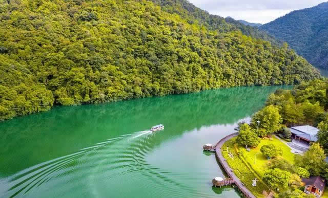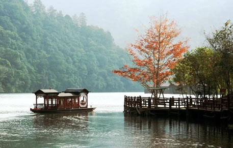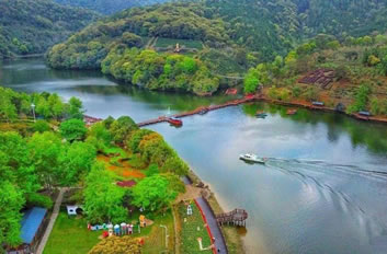 景區(qū)中的水域長(zhǎng)達(dá)七公里,清澈的水流,色彩斑斕的山林倒影,構(gòu)成生機(jī)勃勃的山水畫卷,使人有“舟行碧波上,人在畫中游”的親切感受。這里是各種野生動(dòng)植物的聚集地,有各種奇花異草和珍禽走獸。每年年底到次年的初夏,總有一大群鴛鴦飛臨此地,在這水質(zhì)清純、環(huán)境優(yōu)美的地方過冬,為景區(qū)增添了愛的溫馨,傳播愛的信息。