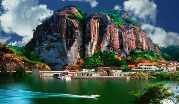 桃源洞因盛產(chǎn)栟櫚樹,古有栟櫚山之稱。風(fēng)景區(qū)起始于唐代,五代后晉年間建有寺廟,到了明代風(fēng)景區(qū)得到較大的發(fā)展。南宋宰相李綱和左正言鄧肅及明代大旅行家徐霞客都曾在此駐足并留有詩句。明代萬歷年間(公元1605年)當(dāng)?shù)匕采叭藘煽に抉R陳源湛捐資建有亭、臺、樓、閣十余處,取“世外桃源”之意改名為桃源洞,并在入口處120米高的赤壁上刻有“桃源洞口”四個(gè)大字,從此桃源洞名聞遐邇。這里丹霞地貌形成了眾多的奇峰峭壁,綠海林濤和碧水丹山。