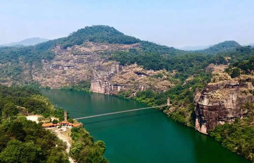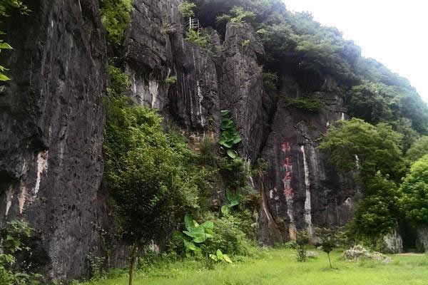 特殊地貌形成兩邊懸崖對峙,這條小澗叫桃花澗,從景區(qū)深處流出,我們的游路也將沿著高山峽谷的縫隙向內(nèi)延伸。桃源洞本沒有“洞”,無論是步行,還是泛舟游覽,都給人一種洞口的感覺右壁的懸崖高達(dá)120米,“桃源洞口”四個(gè)大字刻在36米高處,是明萬歷年間,辭官回永安的名士陳源湛于1605年所題,每字兩米見方。