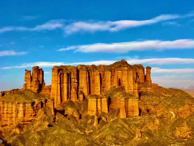冰溝丹霞以砂巖地貌遺跡景觀為主體,是國(guó)內(nèi)窗欞狀宮殿發(fā)育最好、規(guī)模最大的地質(zhì)地貌遺跡,是““窗欞狀宮殿式丹霞”地質(zhì)命名地,被評(píng)為“窗欞狀宮殿式丹霞地貌中國(guó)第一”。景區(qū)內(nèi)廣泛分布丹霞崖壁、石墻、石柱、尖峰、丘陵等地貌形態(tài),尖峭挺拔,連綿不斷,氣勢(shì)宏偉。