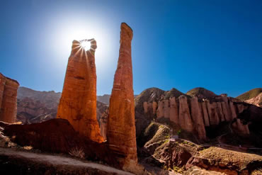 這是冰溝丹霞景區(qū)的又一標(biāo)志性景觀。兩個(gè)并排而立的石柱,高約50米,它是由紫紅色砂巖、礫巖、夾砂礫巖構(gòu)成,在流水沖蝕及凍融風(fēng)化剝蝕等外動(dòng)力作用下,沿著垂直節(jié)理崩塌、解體,使巖墻分割,形成兩個(gè)孤立的直徑不同的石柱,均上細(xì)下粗、上圓下方,說(shuō)明風(fēng)化作用是自上而下進(jìn)行的.石柱下方還基本保留原始節(jié)理切割地層后留下的棱角,形狀像一對(duì)逼真的男女生殖器官。左側(cè)的石柱為男柱,頂端如蘑菇;右側(cè)的石柱為女柱。