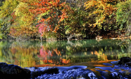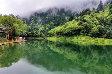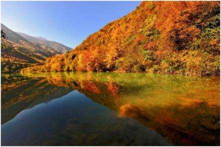 官鵝溝水美。13個(gè)大小不等、形態(tài)各異的湖泊,尤如一串綠色的珍珠鑲嵌在溝內(nèi),湖水清澈透底,隨湖底地貌高低呈不同顏色,那些倒映在湖中的古樹象一條條巨龍臥在湖底。藍(lán)天白云和青山古樹,映入湖中,使天地渾然一體,沒有界限。