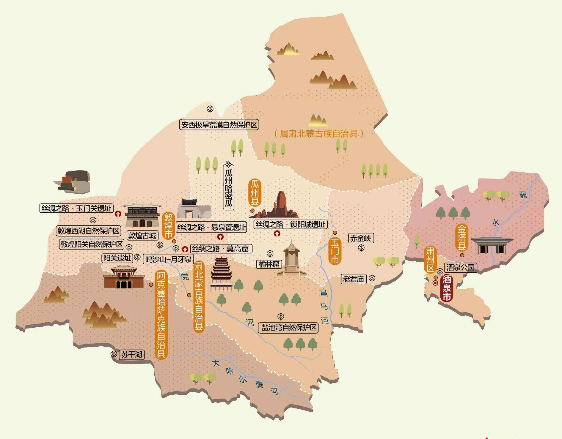 酒泉市為漢代河西四郡之一,絲綢之路的重鎮(zhèn),因“城下有泉”、“其水若酒”而得名。酒泉市是敦煌藝術(shù)的故鄉(xiāng),現(xiàn)代航天的搖籃、新中國(guó)石油和核工業(yè)的發(fā)祥地、“鐵人精神”的誕生地。先后獲影響世界的中國(guó)文化旅游名城、中國(guó)最具國(guó)際影響力旅游目的地等榮譽(yù)稱號(hào)。酒泉市境內(nèi)有敦煌莫高窟、安西鎖陽城、酒泉公園、敦煌雅丹國(guó)家地質(zhì)公園等旅游景點(diǎn)。