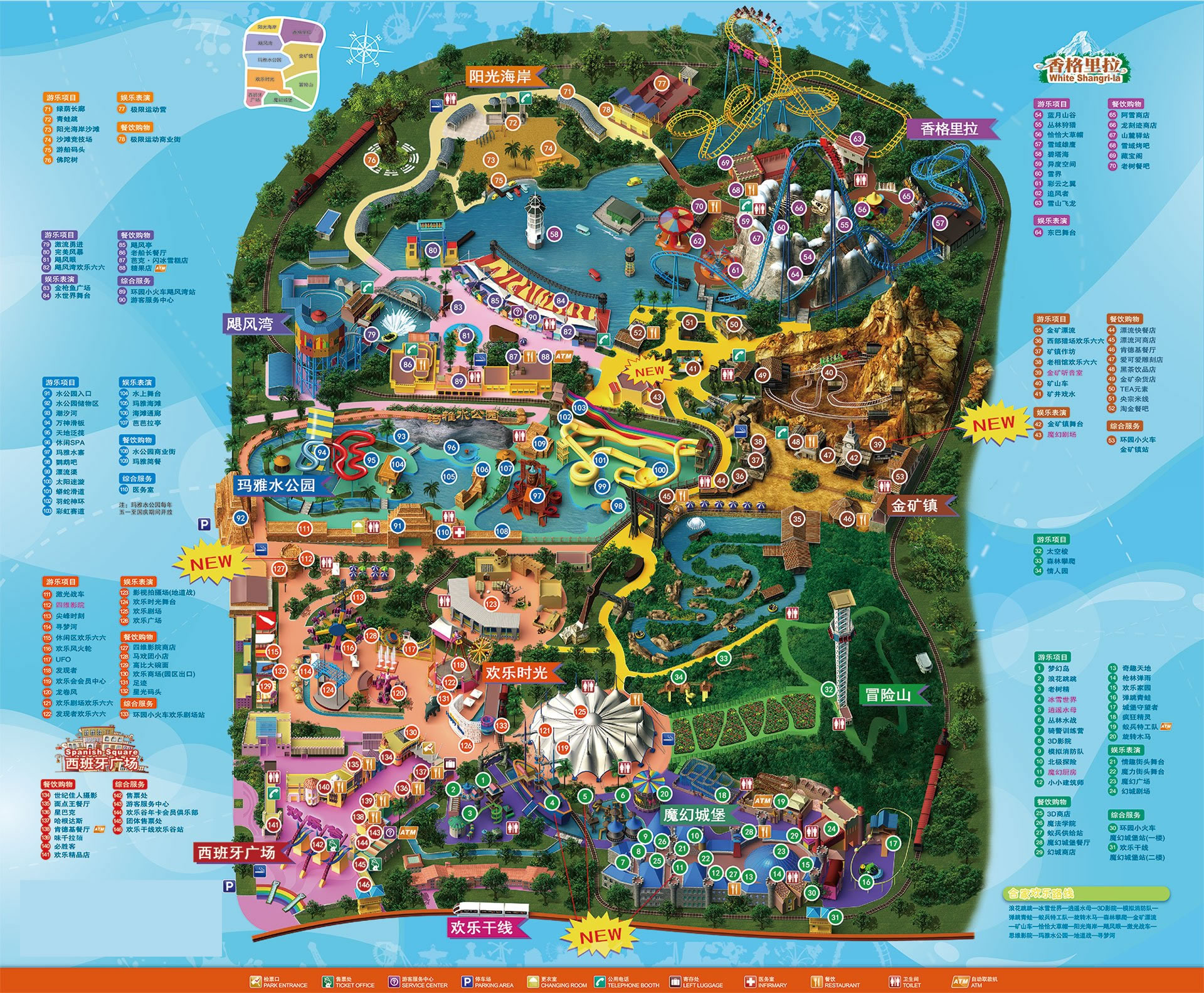 全公園共分八大主題區(qū):西班牙廣場、卡通城、冒險山、歡樂島、金礦鎮(zhèn)、香格里拉森林、颶風(fēng)灣、陽光海岸,加上奇趣的瑪雅水公園,有一百多個老少皆宜、豐富多彩的游樂項目。從美國、荷蘭、德國等發(fā)達(dá)國家引入眾多全國乃至亞洲獨(dú)有的項目:世界最高落差的"激流勇進(jìn)"、中國第一座懸掛式過山車"雪山飛龍"、中國第一座巷道式"礦山車"、中國第一座"完美風(fēng)暴"、中國第一輛"仿古典式環(huán)園小火車"、亞洲最高、中國第一座"驚險之塔"--太空梭、亞洲首座集視覺、聽覺、觸覺于一體的四維影院。這些游樂項目附以了逼真而完美的主題包裝,營造出環(huán)境優(yōu)美宜人,具有美國西部和中國藏北風(fēng)格的景觀。一次次驚心動魄的歷程,一個個撲朔迷離的故事,讓游客仿佛進(jìn)入一個亦真亦幻的神秘境界。