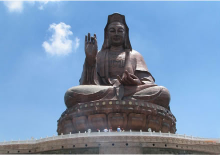 云海蓮臺地處西樵山風景名勝區(qū)中心地帶,是以觀音文化為主題的大型景區(qū)。主要建筑有觀音法相、牌坊、影壁、放生池和浮雕等。觀音法相高達61.9米,是世界上最高的觀音造像。游客從北向入口,迎面聳立著一座六柱五門天柱牌坊,牌坊后隔著一個廣場,建有影壁,用優(yōu)質(zhì)花崗巖雕筑,左右各設山門,壁后刻有觀音六字真言,漢文由九華山住持、安徽省佛教協(xié)會會長仁德手書,藏文由西藏活佛親筆題寫。影壁上還刻有韋陀法像。影壁后為一放生池,池旁圍以蓮花作雕的白石欄桿,跨過放生池上的石拱橋,沿著283級開闊而整齊的石臺階,便可達觀音法像的蓮花座下。