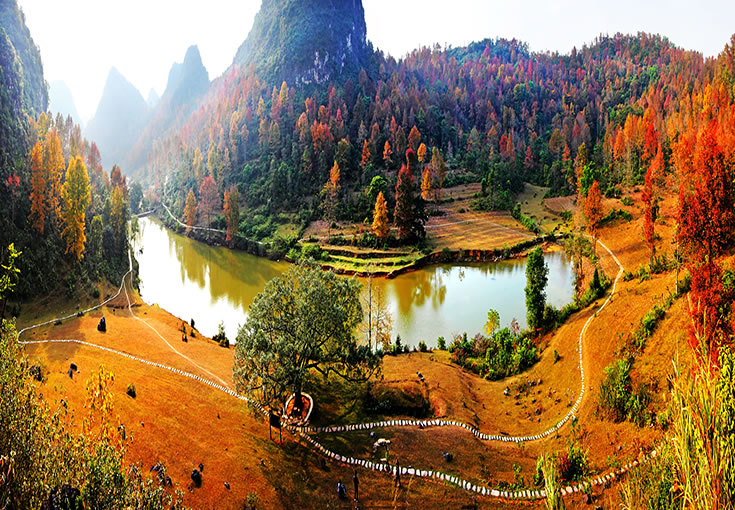 紅葉森林公園位于德?h東北側(cè)方向,國家AAAA級旅游景區(qū)暨自治區(qū)級森林公園,距縣城3.5公里,交通便利。公園規(guī)劃面積1036.5公頃,該公園核心景區(qū)為紅楓湖游覽區(qū)和紅葉谷游覽區(qū),以紅楓為主題。金秋時節(jié),楓葉似火,湖水輕柔,互襯互耀,頗具詩情畫意。公園的紅葉品種主要以楓香為主,葉子顏色分別有深紅、絳紅、霞紅、黃紅混合等,觀賞時間較長,有著“德保楓葉賽九寨”的美譽,是秋季里一道亮麗的風景線。公園以紅楓湖、紅葉谷一帶的紅楓林為依托,襯托著多姿多彩的紅葉森林景觀、森林生態(tài)景觀、底蘊深厚的人文景觀和綺麗迷人的水文景觀,將紅楓湖、上章湖、紅葉谷構(gòu)成休閑避暑游覽的大旅游圈,景區(qū)內(nèi)上章水庫和百布水庫交相輝映,總庫容量分別為365萬立方米和190萬立方米;有效灌溉面積分別為2200畝和2000畝。目前,景區(qū)各項基礎(chǔ)設(shè)施正在逐步完善。德保境內(nèi)有10萬多畝連片的紅楓林,遍布城關(guān)、那甲、馬隘、巴頭等鄉(xiāng)鎮(zhèn)。除紅葉森林公園外,馬隘至巴頭一線還有許多別具特色的賞楓景點,無一不令人流連忘返。
