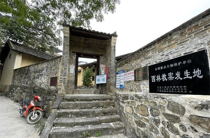 位于現(xiàn)田林縣定安鎮(zhèn),1852年起,法國侵略者派天主教神甫馬賴潛到田林縣定安鎮(zhèn)一帶,以傳教為名進(jìn)行非法活動。馬賴等人目無官府,肆意橫行。1856年2月,西林縣知事張鳴風(fēng)順應(yīng)民心,依法將馬賴及其忠實(shí)信徒白小滿、曹貴(女)等三人在定安教場斬首示眾,這就是當(dāng)時(shí)震驚中外的“西林教案”事件,也稱馬神甫事件。法國拿破侖三世以此為借口,與英國侵略者串通一氣,向中國發(fā)動第二次鴉片戰(zhàn)爭,并強(qiáng)迫清政府在西林縣城定安鎮(zhèn)建起規(guī)模較大的天主教堂,定安鎮(zhèn)從此成為法國傳教士宣傳洋教的一個(gè)據(jù)點(diǎn)。 鑒于“西林教案”曾經(jīng)是近代中國人民反洋教斗爭高潮的前奏的特殊歷史意義,1994年自治區(qū)政府將其列為文物保護(hù)單位。