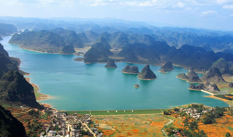 渠洋湖,是一個大型的喀斯特高原湖泊水庫。庫區(qū)總?cè)萘?228平方米,水質(zhì)優(yōu)良,有大小島嶼十多個,沿岸有海拔一千多米的岜行山,以及掩映在綠樹翠竹當(dāng)中的幾百個壯族干欄式村寨。