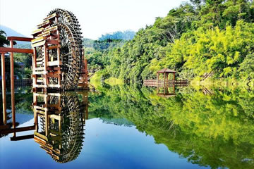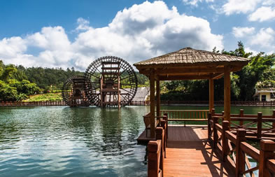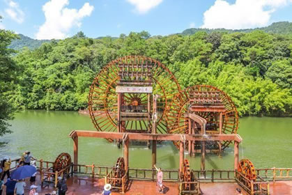 位于八寨溝景區(qū)大門外,是一個人工湖,湖面寬廣,三面環(huán)山,景色秀麗,可乘木船游覽龍珠湖風光,混凝土大壩外有人工瀑布,瀑布下面是深水潭,有一架仿古大水車,在流水驅(qū)動下不停轉(zhuǎn)動。