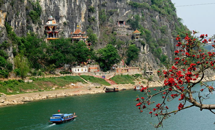 金雞巖位于縣城西北隅,坐落在架山腰間,瀕臨左江,與扶綏中學(xué)隔江相望。 [22]主洞面積40多平方米,高4米、內(nèi)設(shè)有金雞娘娘、斑民夫人、花公、花婆、花木蘭等塑像。洞口左側(cè)有伏波亭,右側(cè)有伏波將軍塑像。沿江岸有103級石階通往洞口。金雞巖為明代遺址。相傳金雞娘娘于此修道成正果,故名“金雞巖”。明代著名地理學(xué)家、旅行家徐霞客留下“三誤三返”游跡;清代名人劉宅俊在懸崖巖壁上刻鐫著“雞巖帆影”題詞;道光癸卯年記載著李佑會題刻銘詩。