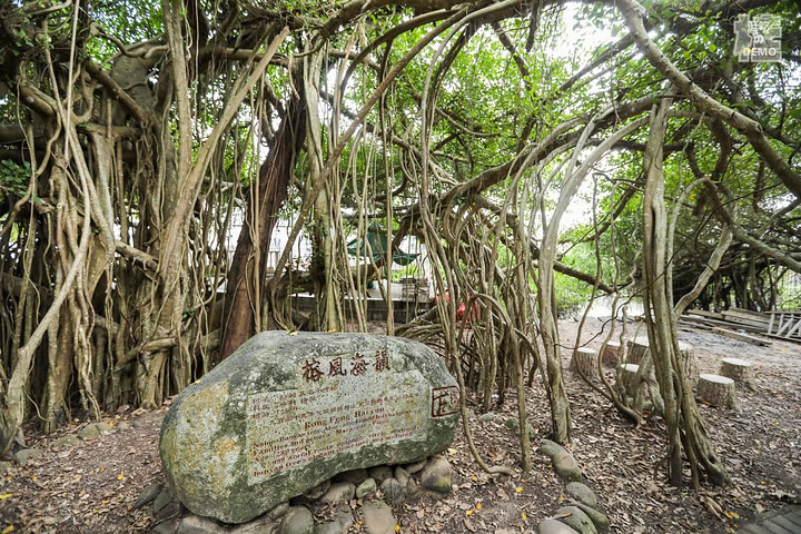 竹山古榕部落由一棵一千三百多年的古榕和眾多小葉榕組成。古榕為高山榕,榕樹高大挺拔,樹干需十三個成人張開雙臂才能合抱。而這一株株榕樹,也許是海風(fēng)終年吹拂的緣故,榕樹長到一定高度后就橫向生長,長出許多氣根,氣根接觸地面后長成一根根枝干,這樣的氣根不知多少,數(shù)不勝數(shù),遠(yuǎn)遠(yuǎn)望去,一株榕樹就是一片樹林,在綠茵如水的野芋叢中,構(gòu)成了“頃地一古榕,飛瀑掛潭中”的佳景,打造了古榕部落“雙龍出海”、“四郎探母”、“六柱擎天”、“八仙會聚”以及榕樹瀑、榕樹墻、榕樹戀、榕樹侶等惟妙惟肖的生態(tài)奇觀。