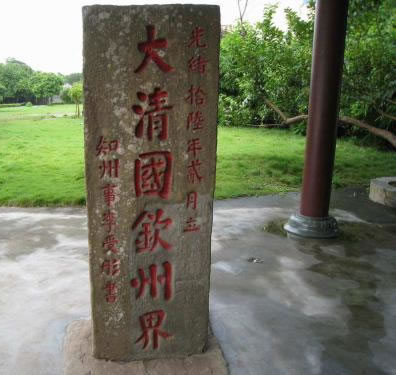 大清國一號界碑位于北侖河出?诘男∩狡律,碑高1.7米,寬0.7米,厚0.4米,用沿海所產(chǎn)的海蝕巖鑿成。界碑正面書“大清國欽州界·知州李受彤書·光緒十六年二月立”,涂著紅漆的莊嚴(yán)雄渾的大楷碑文透著一股不可侵犯的凜然正氣。這塊飽受長年風(fēng)吹日曬雨淋而益顯滄桑的巨石,一直昂揚地巍然屹立著,向每一個游客訴說著100多年來的每一段歷史。