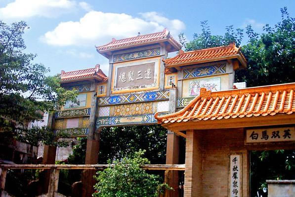 平南縣城東七十里的白馬圩風(fēng)景區(qū)。該處有明督師袁崇煥故里和南漢梁嵩狀元廟遺址。梁嵩為五代南漢時人,經(jīng)苦學(xué)考取狀元及第,仕至翰林學(xué)士,因不滿虐政,辭官歸里,過白馬東濠河溺歿,州人感其請蠲免龔州丁賦之德,立廟以祀。袁崇煥詔授兵部尚書兼三邊總制時,曾在家鄉(xiāng)平南白馬建有“總制三邊坊”。1986年,在白馬圩重建改建了“袁崇煥總制三邊坊”和“梁嵩紀(jì)念館”,與巍巍辰嶺,悠悠碧水,互相輝映,殊為壯觀
