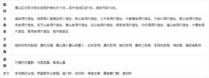 雁山區(qū)境內(nèi)風(fēng)景名勝有漓江、相思江、冠巖、父子巖等山水自然風(fēng)貌;有雁山公園、唐氏莊園、相思埭遺址、廟巖洞穴遺址、桂州窯窯址、竹園漢墓群、馬君武墓、羅盛教烈士陵園等自治區(qū)、市文物保護(hù)單位;有壽崴古寨、雁咸古寨門、潛經(jīng)白氏宗祠、潛經(jīng)清真寺、竹園廟門橋等古寨古建筑;有冠巖景區(qū)、愚自樂園、雁山植物園、神龍谷、蛇王李莊園、龍門古榕等生態(tài)園林人文融合景觀。其中漓江雁山段是桂林漓江景區(qū)5A級景區(qū)的一部分;桂林冠巖景區(qū)、愚自樂園是4A級景區(qū);神龍水世界景區(qū)、多耶古寨——蛇王李景區(qū)是3A級景區(qū)。