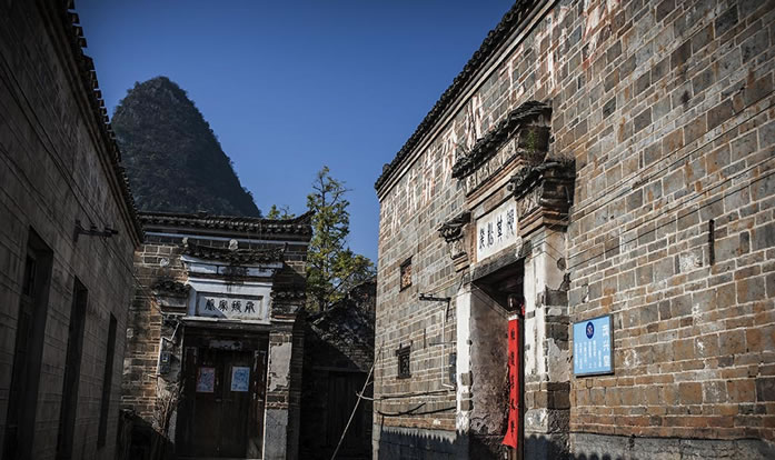 在明洪武年間,山東一位被貶的秦姓官員千里跋涉來到桂北地區(qū),據村民說,他們是唐代名將秦瓊的后人。后來秦氏的一支看中了水源頭村自周的山形地勢,于是選取了這個“風水寶地”落下根基。經過多年繁衍,漸成規(guī)模。在后籠山下,依山勢拾級而建成了成片的大宅子,當地人稱其為“秦家大院”。這些宅子基本為三進三開,房屋分為四組,組與組間隔兩米,形成狹長的巷道,均以青石板鋪筑。宅子的高堂、戲院、花廳都敞開大門,兩旁房子的大門朝里開,很有意思。宅子的墻壁都以幾噸重的青石方墩為基,砌上1米多后,改用青磚砌至屋頂,很獨特。高大敞亮的上層樓房,窗戶上鑲嵌的窗花是琉璃瓦燒制而成,上面還畫著花卉,溫婉中透著古色古香。房中的板壁上刻著各種花紋的圖案,庭柱下的石礅上鑿有龍鳳的花飾,精細美觀。