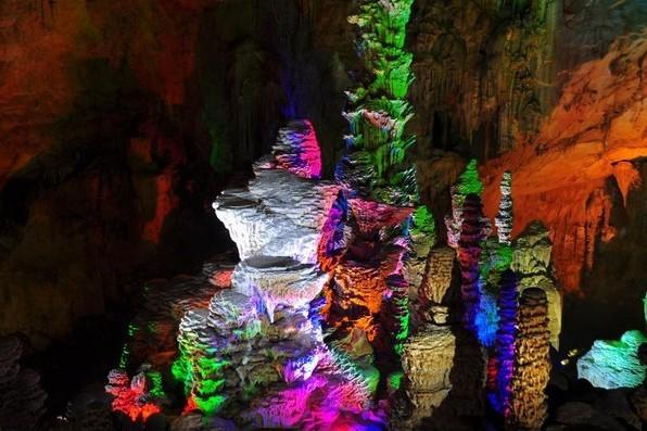 鴛鴦洞,位于縣城東面,鳳凰山腰,海拔700余米,為云貴高原南緣巖溶中高位雙層溶洞,洞中石柱、石筍、石幔琳瑯滿目。洞口高7.5m,寬12m。洞長480米,最寬處320米,巖廳最高點(diǎn)52米,面積為2.5萬平方米,洞內(nèi)大廳規(guī)模宏大。從洞口進(jìn)入便是第一層洞,游程迂回全長1200米,洞中乳石崢嶸,石筍高達(dá)36.4m,象擎天巨柱直插天空,20m以上高度的石筍約15個,6m左右高度的石筍更是不計(jì)其數(shù),在多處聚集形成了奇特的洞中石林景觀。洞內(nèi)最大的石幔高約15m,寬6m,顏色潔白,酷似瀑布。