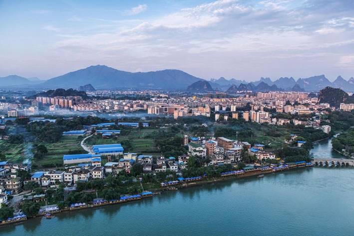 地形地貌 富川瑤族自治縣位于桂東北山區(qū),四面環(huán)山,中間低落,略呈橢圓形盆地,地勢(shì)北高南低。西部及東南部分布著橫亙連綿的山脈,谷深坡陡,地勢(shì)高峻;東部為石灰?guī)r溶蝕而成的巖溶峰林地貌,群峰拔挺;東北面為丘陵地貌,頂圓坡緩,波狀起伏;中部為寬坦的溶蝕平原地區(qū),地勢(shì)低陲,孤峰獨(dú)山拔地而起。
