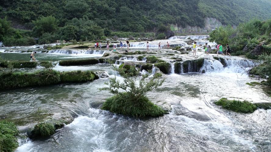 響水瀑布洛江灘頭,河水奔流而下,其聲隆隆,遠(yuǎn)聞若雷,近聞似鼓,四季如此,故此得名“響水”。此響水灘為典型的喀斯特地貌,水流呈階梯狀分布,在地質(zhì)學(xué)上稱(chēng)為邊石壩,所含成份多為鈣化石?膳c九寨溝五彩池比美。