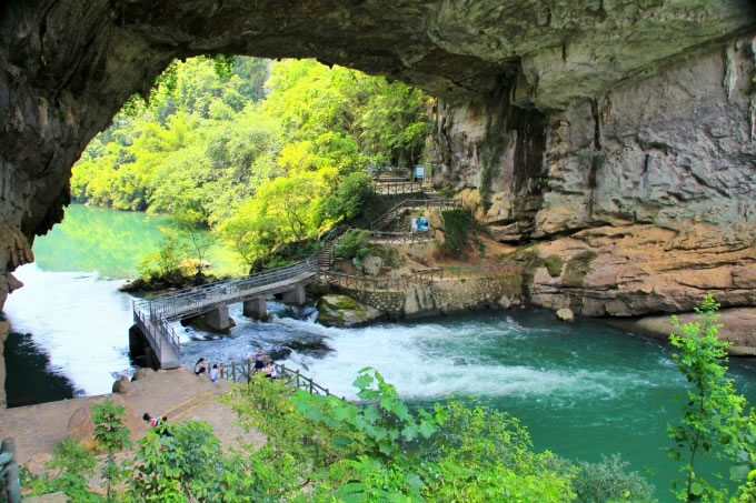 天生橋橋洞拱高35米,橋面長(zhǎng)寬度各40米。這里有一個(gè)美麗動(dòng)人的傳說(shuō),以前這里沒(méi)有橋,過(guò)河極為不便,遠(yuǎn)在洛陽(yáng)的魯班師傅知道后,揮動(dòng)他手中的板斧一揮而就,當(dāng)?shù)氐睦习傩諡楦兄x他,就送了三顆香桃給他,當(dāng)時(shí)正值陽(yáng)春三月,桃紅柳綠,魯班師傅就把此橋稱(chēng)之為“香橋”。