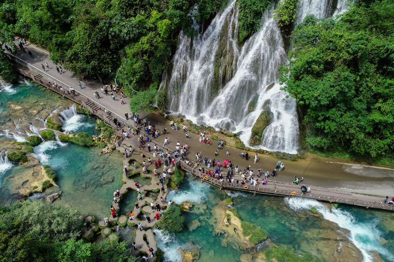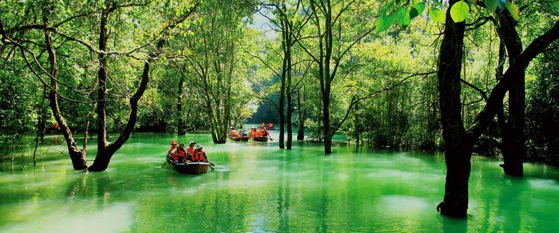 水上森林,長(zhǎng)約600米,分上下兩段。河谷里叢生著茂密的喬木和灌木,形成一道翡翠屏障。清澈的河水從河床的雜木林中穿涌而下。年復(fù)一年,日復(fù)一日的沖涮,河床已沒有了一粒泥沙,連磐石也被激流磨光了棱角而變得“圓滑”,樹木卻扎根在河床里,紋絲不動(dòng),四季常青。是“水在石上淌,樹在水中長(zhǎng)”的奇景。